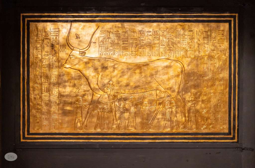 Le dernier lit représente une génisse au pelage tacheté imitant la panthère et évoquant le ciel étoilé, elle personnifie la déesse Mehetouret qui aurait été la première a émergé de Noun, l’océan primordial.