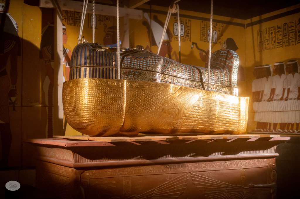 Que contenait elle ? Trois autres chapelles emboîtées les unes dans les autres protégeaient le sarcophage. Dans celui-ci, se trouve 3 cercueils dont un en or qui contenait la momie avec un masque d’or pur.