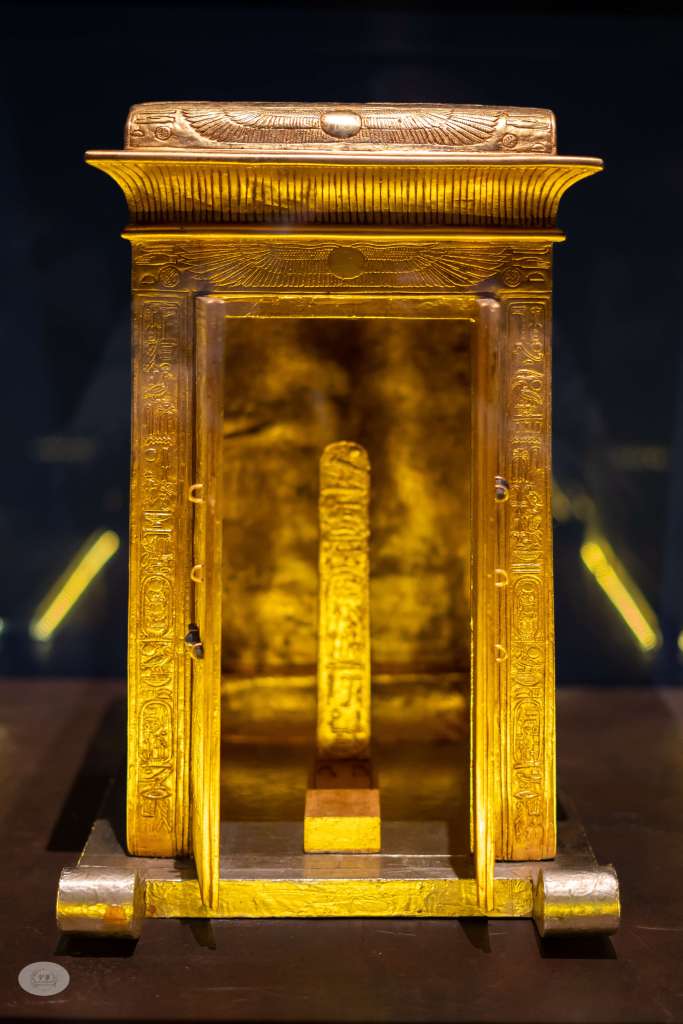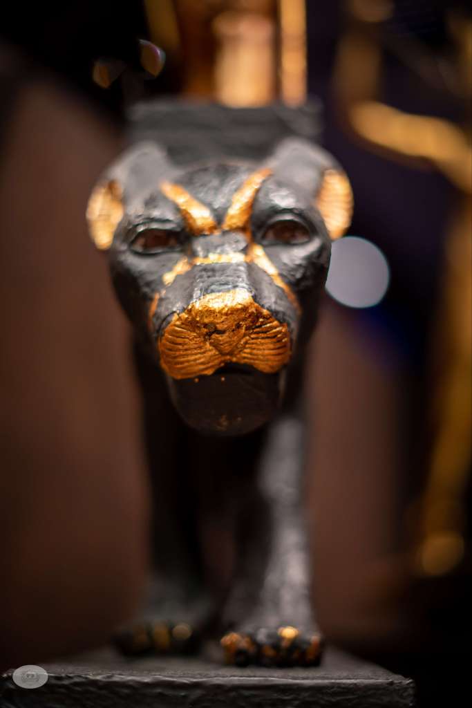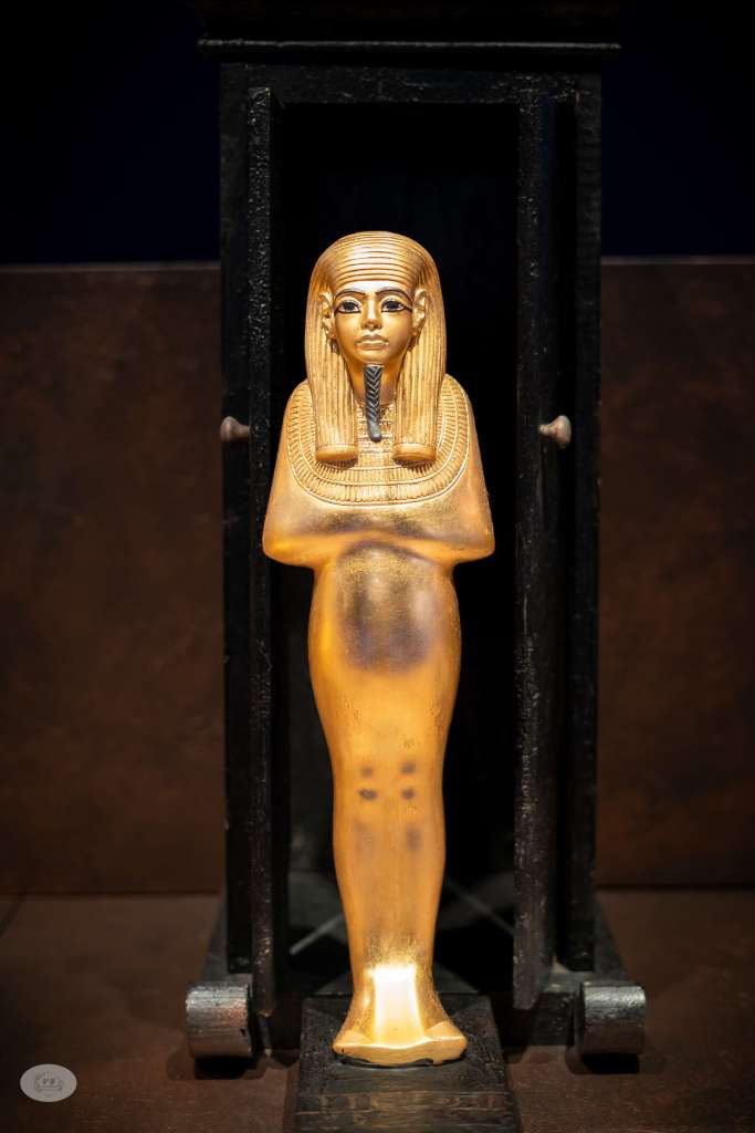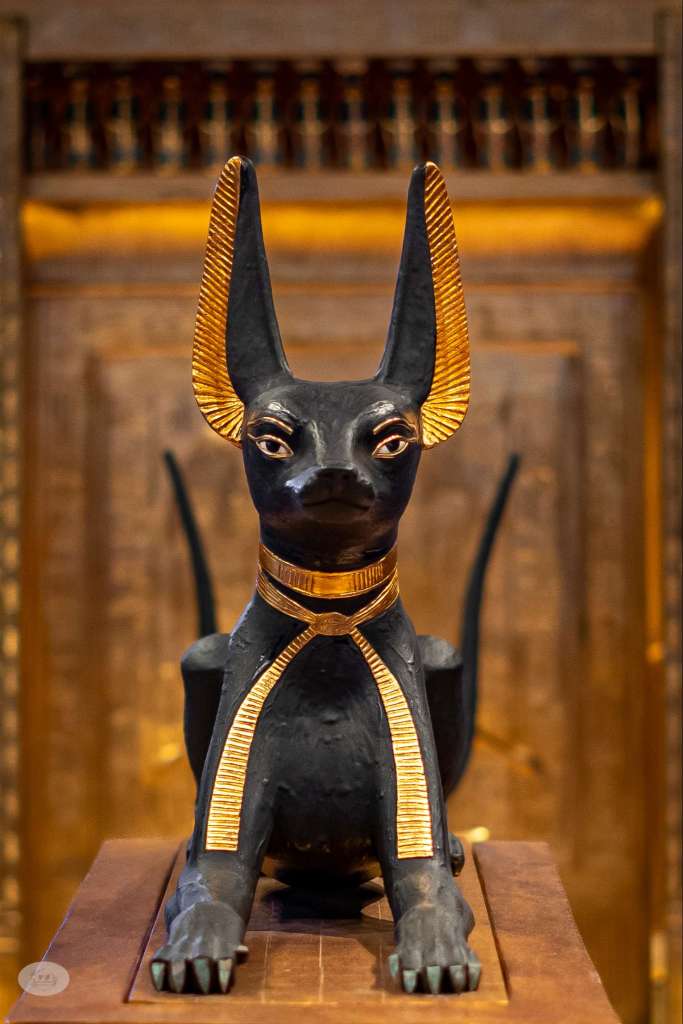 Continuons les découvertes, devant la chambre aux trésors se trouve Anubis, le dieu chacal. Un impressionnant chacal noir et doré est couché sur un coffre doré. Les oreilles dressées, il porte un ruban en or et monte la garde en silence. C’est Anubis , le dieu funéraire dans l’Égypte antique. Il est le gardien des partes du royaume des morts, maître des nécropoles et protecteur des embaumeurs.