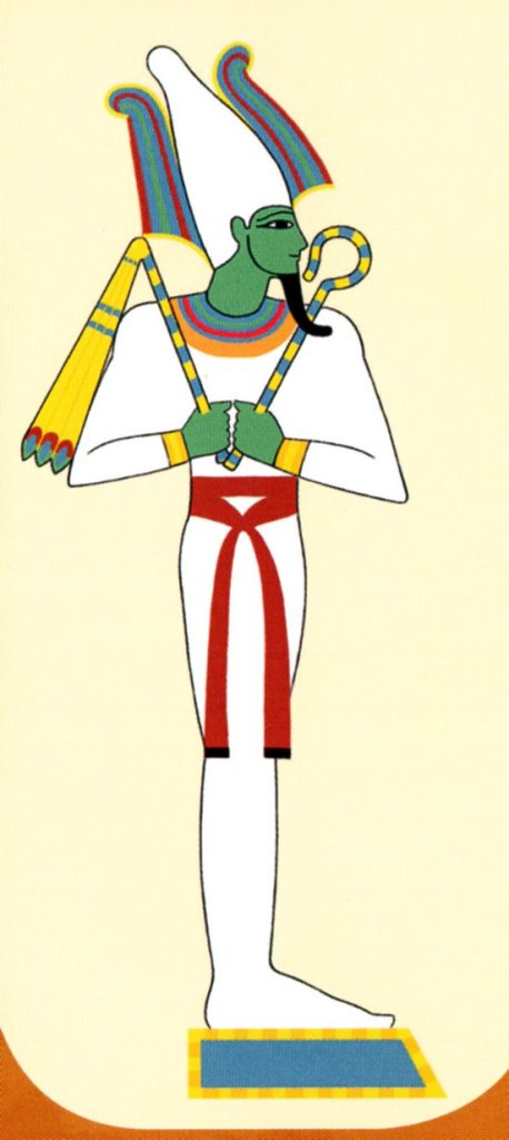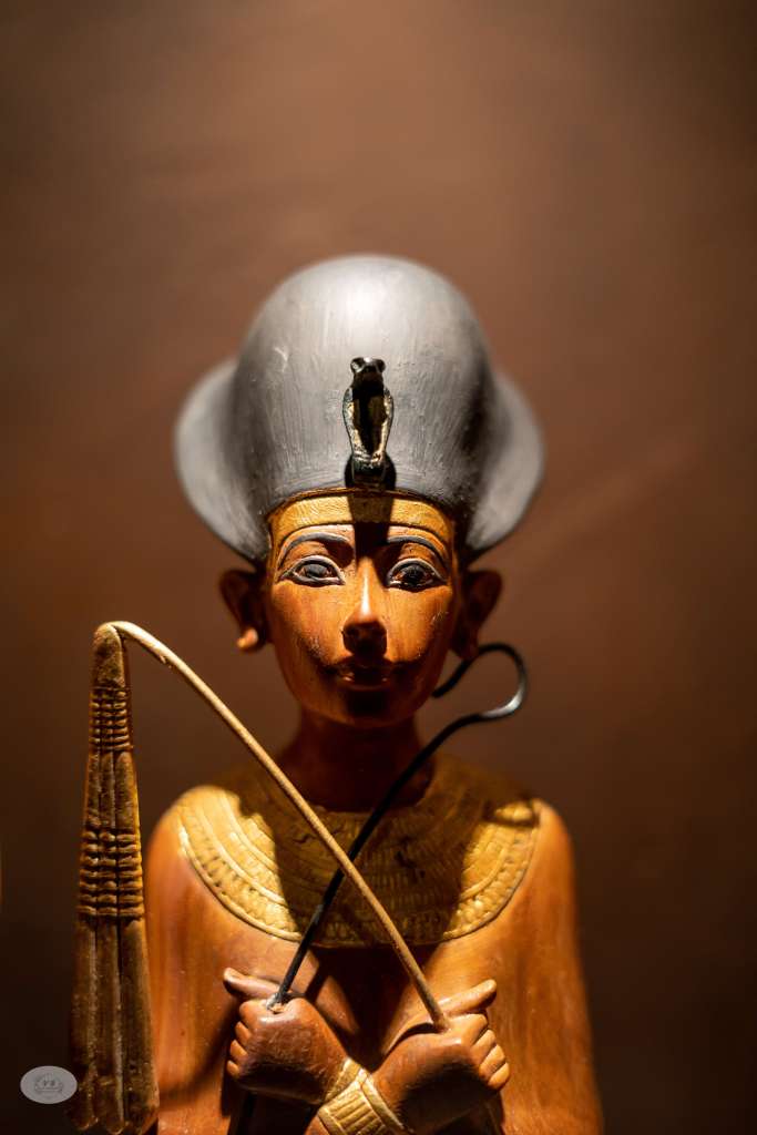 Dans la main droite un fléau, symbole de protection et de fécondité. Outil agricole qui sert à battre les céréales, faisant référence au symbole du pharaon qui est le père nourricier du peuple.