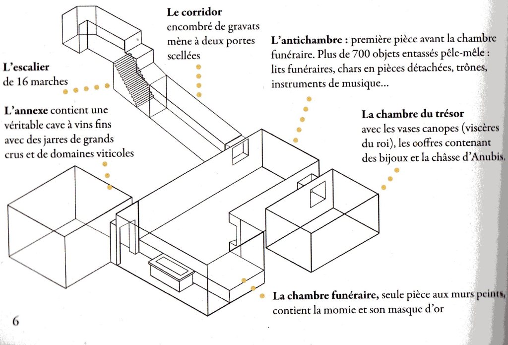 Dans l’antichambre, la première pièce dans laquelle on rentre dans le tombeau était remplie d’objets comme des jeu de table, des coffres en or et en ivoire, des cannes, une tête en bois émergeant d’un lotus bleu, 6 chars en pièces détachées (car il n’y avait pas assez de place pour les mettre en entier), des provisions pour les défunts.