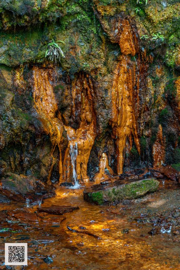 Déjà, toutes les pierres qui sont au sol à tes pieds sont recouverte de rouille. Puis quand tu arrives au niveau de la source, le tracé ceusé par l’eau est d’une couleur orangé. Rouille quoi, vraiment de l’eau chargée en minéraux de fer. C’est finalement à voir au moins une fois dans sa vie. En plus, lorsque tu t’approches de la source, avec ces couleurs orange et vert de la nature, ça en devient vraiment particulier. Soit, entre les fougères et les plantes grimpantes, c’est vraiment un décor particulier et j’adore cela.