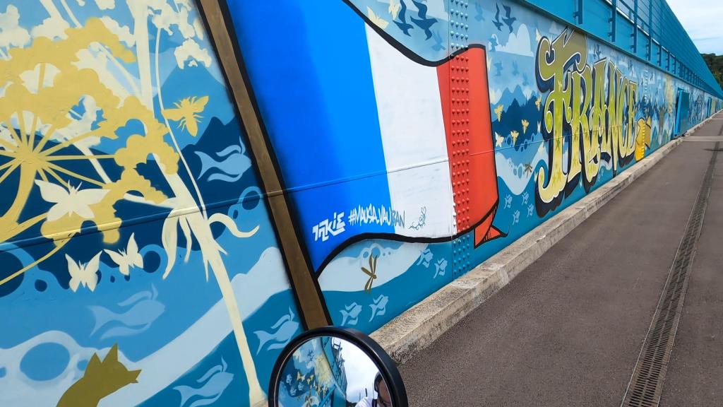 Après quelques kilomètres, nous voilà à côté de la Marina pour les bateaux de plaisance. C’est un yacht club : NCB – Nautic Club Burkheim. Quand tu es là, tu vois plus loin deux possibilités qui s’offrent à toi. Soit tu continues ton bonhomme de chemin, soit tu passes le barrage qui est apparemment autorisé. Enfin, c’est ce que nous avons compris, car c’est ce que nous avons fait. Sur le barrage EDF de Marckolsheim (Bas-Rhin), le long de la nouvelle piste cyclable reliant la France et l’Allemagne, le street artiste anglais, Inkie, a réalisé la fresque censée être la plus longue d’Europe peinte par un seul homme.