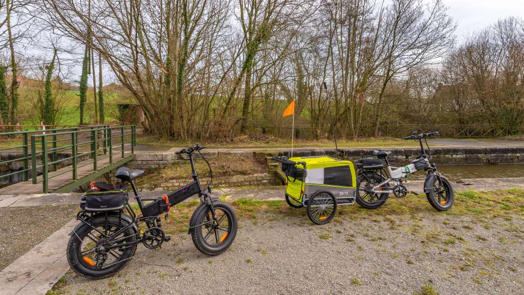 Que ce soit à pied ou à vélo. Nous mettons tout notre barda dans la remorque et nous voilà partis par la route jusqu’au plan incliné.