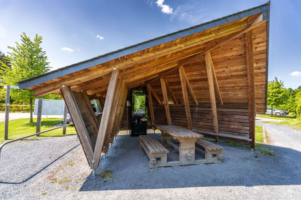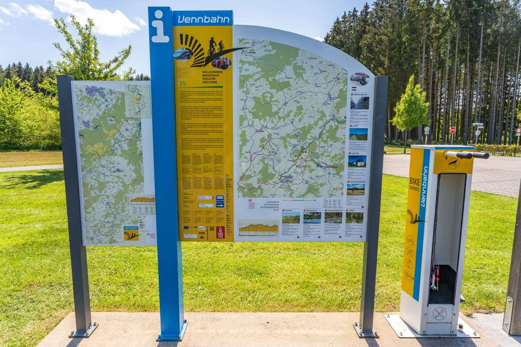 C’est l’endroit idéal pour se restaurer, se reposer un moment ou simplement profiter du paysage avant d’aborder la suite du trajet vers Burg Reuland. L’ombre des arbres en fait un coin agréable même lors des journées plus chaudes, et sa proximité avec la Vennbahn permet de reprendre facilement la route. N’oubliez pas vos chargeurs de vélo, c’est l’endroit idéal pour recharger !