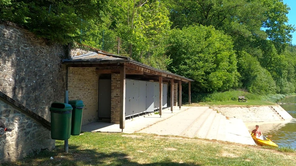 Juste à côté des tables de pique nique, nous découvrons des toilettes publiques et des cabines de change destinées aux kayakistes, mais très pratiques aussi pour les cyclistes de passage. Un petit confort bienvenu !